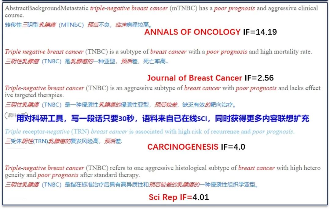 更重要的是,这个神器在我们的本意 (三阴性乳腺癌的临床预后较差) 基础上提供了相关语境的短语:预后不良,临床病程,死亡率高,侵袭性亚型,缺少靶向治疗,复发风险高...